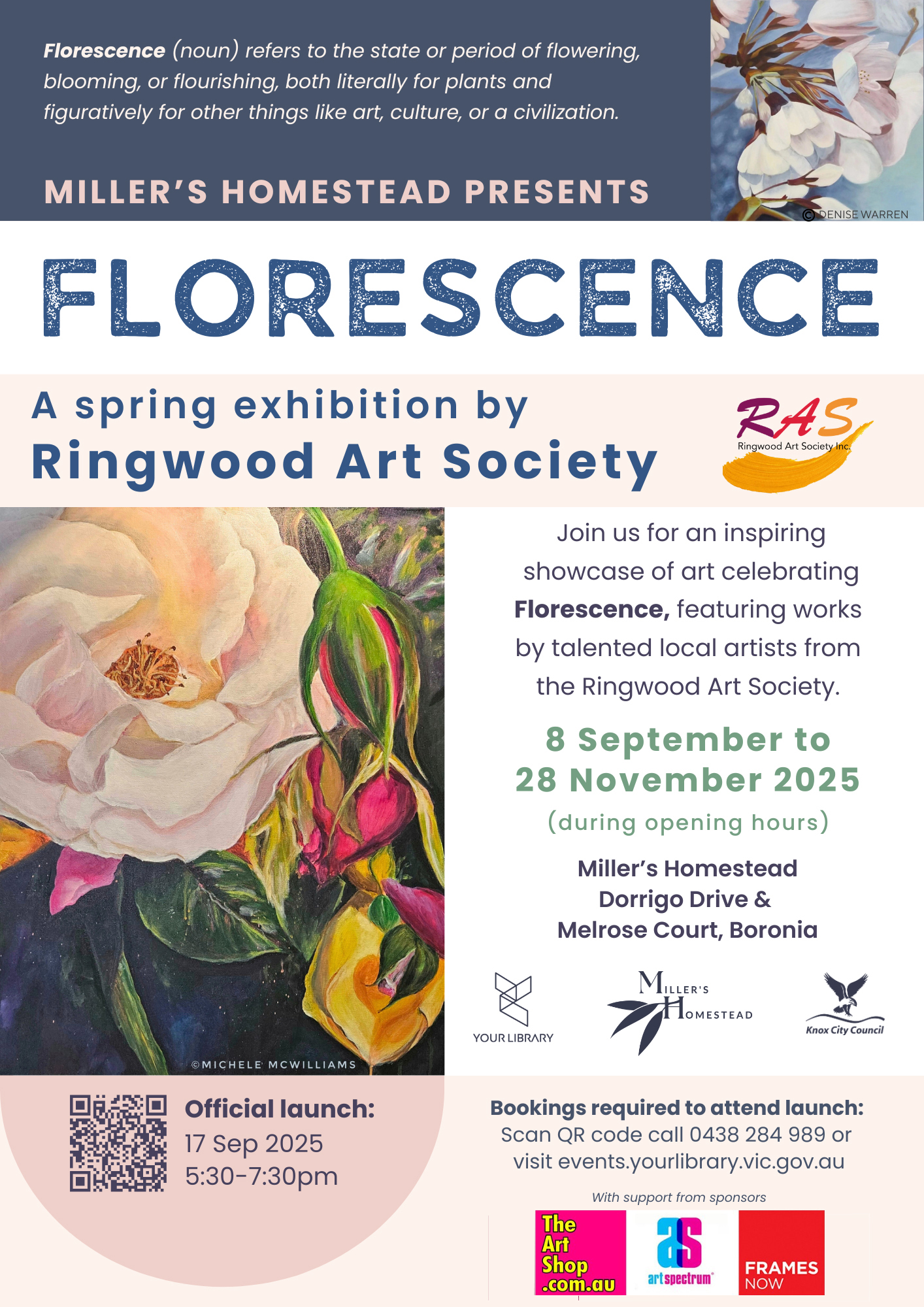 Maroondah Federation Estate 32 Greenwood Avenue, Ringwood, VIC, AustraliaRAS Presents with Miller's Homestead - Florescence Exhibition Florescence (noun) refers to the state or period of flowering, blooming, or flourishing, both literally for plants and figuratively for other things like art, culture, or a Join us for an inspiring showcase of art celebrating Florescence, featuring works by talented local artists from the Ringwood Art Society. 8 September to 28…